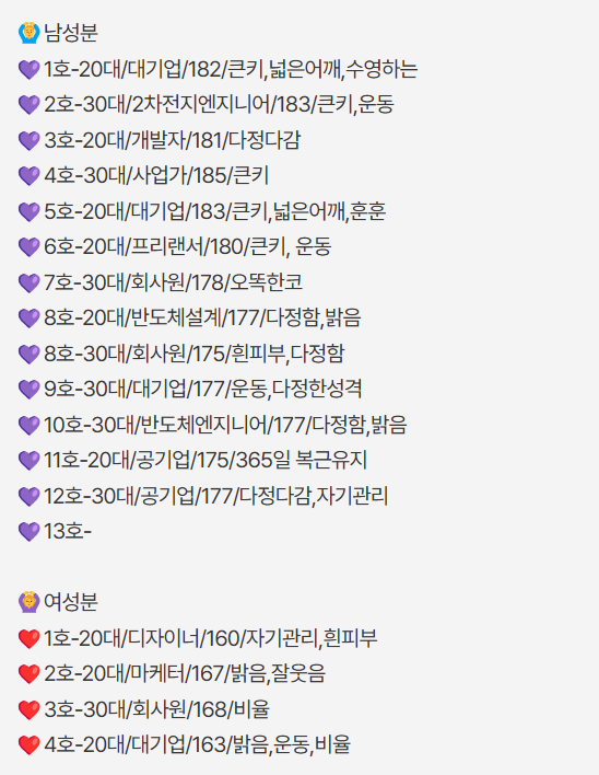 나이로 분류하며 남자들은 키로 짜르는 경우가 많고, 대기업, 공기업, 공무원 등의 직업군이 많음.